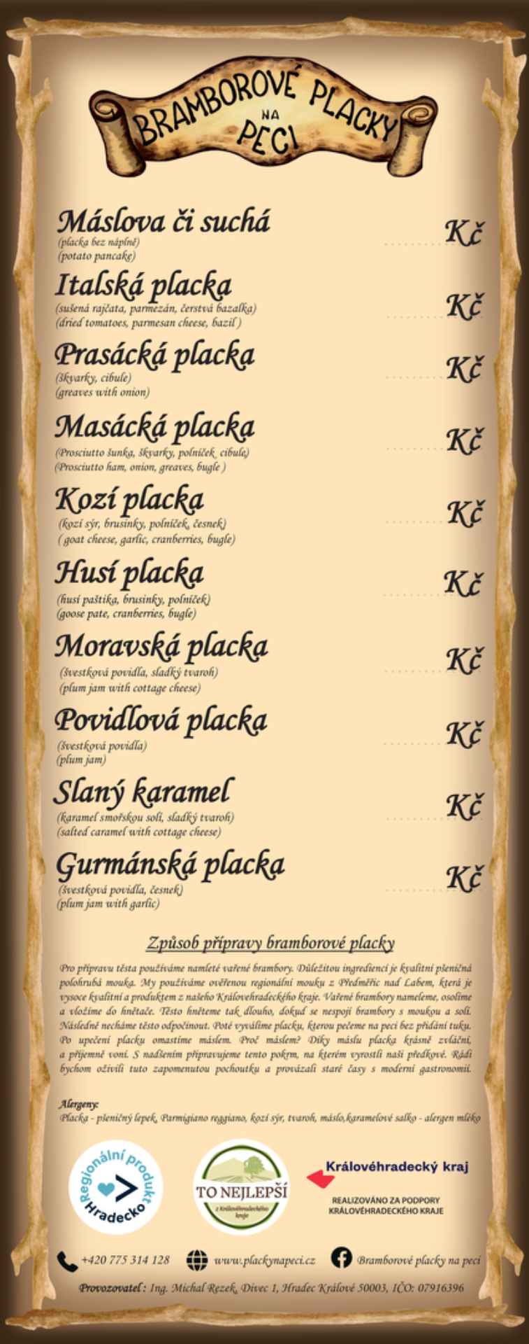Jsme stylový stánek, ve kterém pečeme bramborové placky na vlastní peci. Pro přípravu těsta používáme namleté vařené brambory a jako klíčovou surovinu kvalitní pšeničnou polohrubou mouku. Pracujeme s ověřenou regionální moukou z Předměřic nad Labem, která vyniká vysokou kvalitou a je produktem Královéhradeckého kraje.